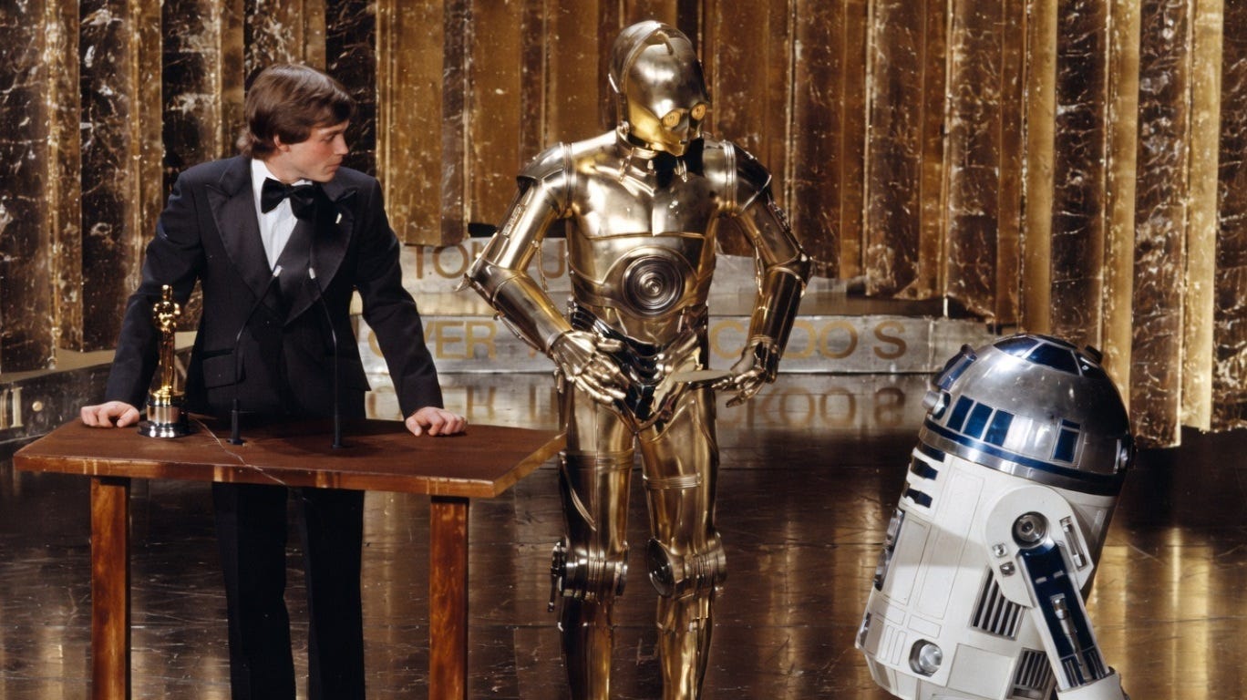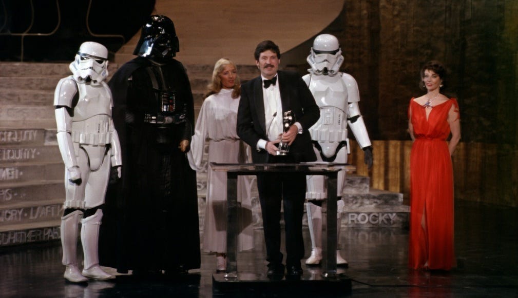 Meu interesse pelo Oscar na virada dos anos 1970 para 1980 começou, como tudo ligado ao cinema na minha história, com Guerra nas Estrelas (neste artigo não cabe chamar de Star Wars). Eu queria ver os atores no palco, as criaturas, a celebração das pessoas por trás das câmeras que realizaram aquilo que eu, como criança, já queria entender como foi feito. (Na foto acima, o figurinista John Mollo leva o Oscar da categoria pelo filme de George Lucas).